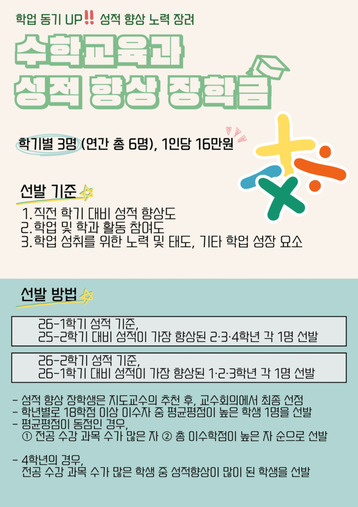 다음의 선발 기준에 따라 수학교육과 재학생 중에서 1학기와 2학기 각각 3명씩, 총 6명을 선정하여 성적 향상 장학금을 지급합니다.